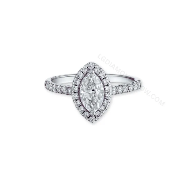 במרכזה של טבעת ה Halo ניצב יהלום מרקיזה מרשים. צורתו האלגנטית והמחודדת של היהלום המרכזי, מעניקה לטבעת מראה מלכותי. מסביב ליהלום המרקיזה המרכזי מסודרים בעדינות 16 יהלומים עגולים קטנים, כל אחד במשקל 0.01 קראט, היוצרים הילה זוהרת המעצימה את יופיו של היהלום המרכזי. היהלומים הקטנים הללו משובצים בדיוק מרבי כך שהם עוקבים אחר הצורה הייחודית של יהלום המרקיזה.