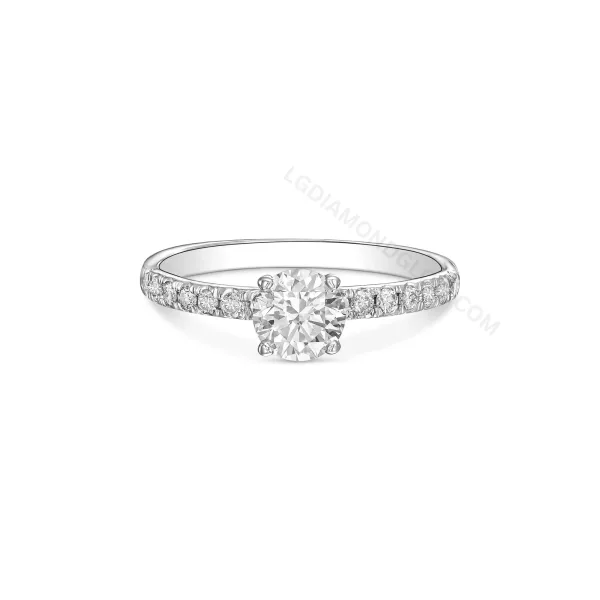 הטבעת עצמה, העשויה מזהב איכותי, מעוצבת בקפידה עם שורה מנצנצת של ארבעה-עשר יהלומים קטנים ומבריקים – שבעה בכל צד של היהלום המרכזי. היהלומים המשובצים בטבעת מוסיפים נצנוץ וזוהר לאורך החישוק, יוצרים מעטפת של אור המשלימה בעדינות את היהלום העגול המרכזי. הטבעת מעוצבת כך שהיהלומים הצדדיים משובצים בגובה מושלם כדי ליצור זרימה הרמונית עם היהלום המרכזי, כאשר ארבע שיניים אלגנטיות ומדויקות אוחזות בו בבטחה ומרימות אותו בזווית מושלמת.